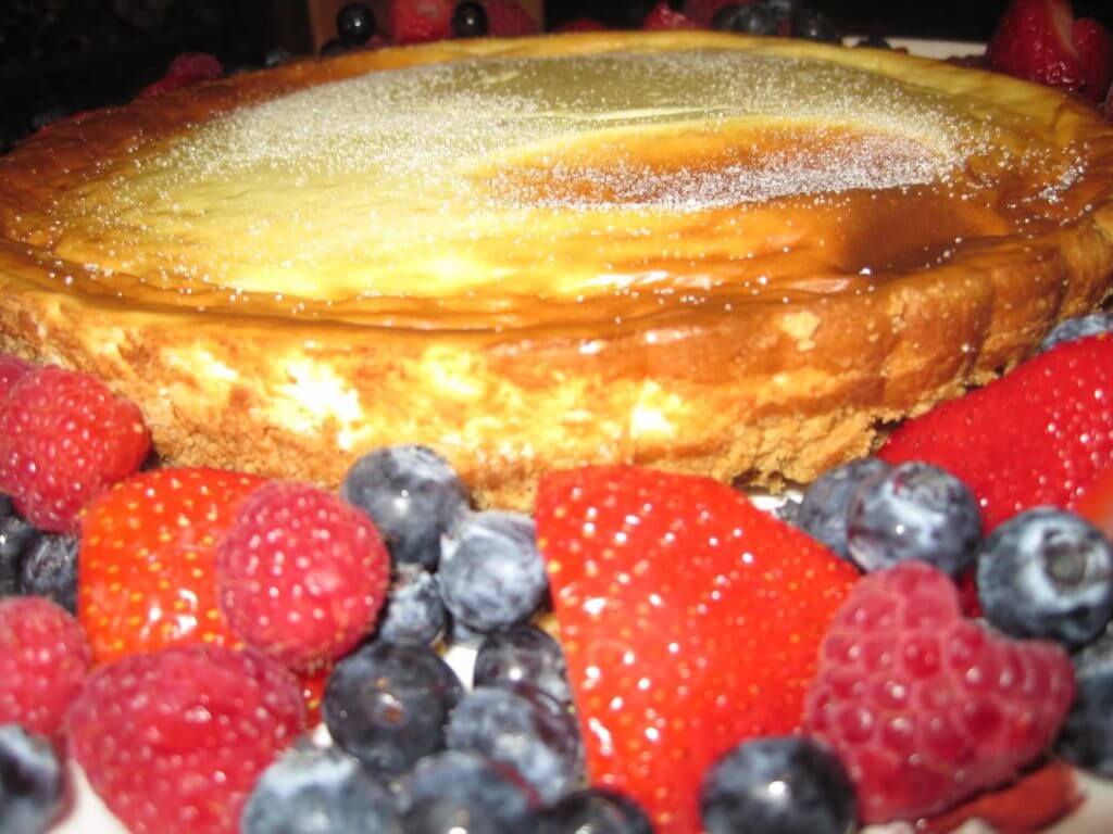 5. 5. Refrigerate the cheesecake until completely cool, about 4 or 6 hours. Sprinkle with sugar on top and invert twice so it comes out of the pan but is served top side up.