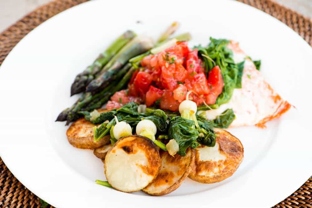 2 chicken breasts, sliced in half horizontally 30g spinach leaves 3 potatoes, rinsed and sliced in 1/4″ disks 1 bunch asparagus paprika