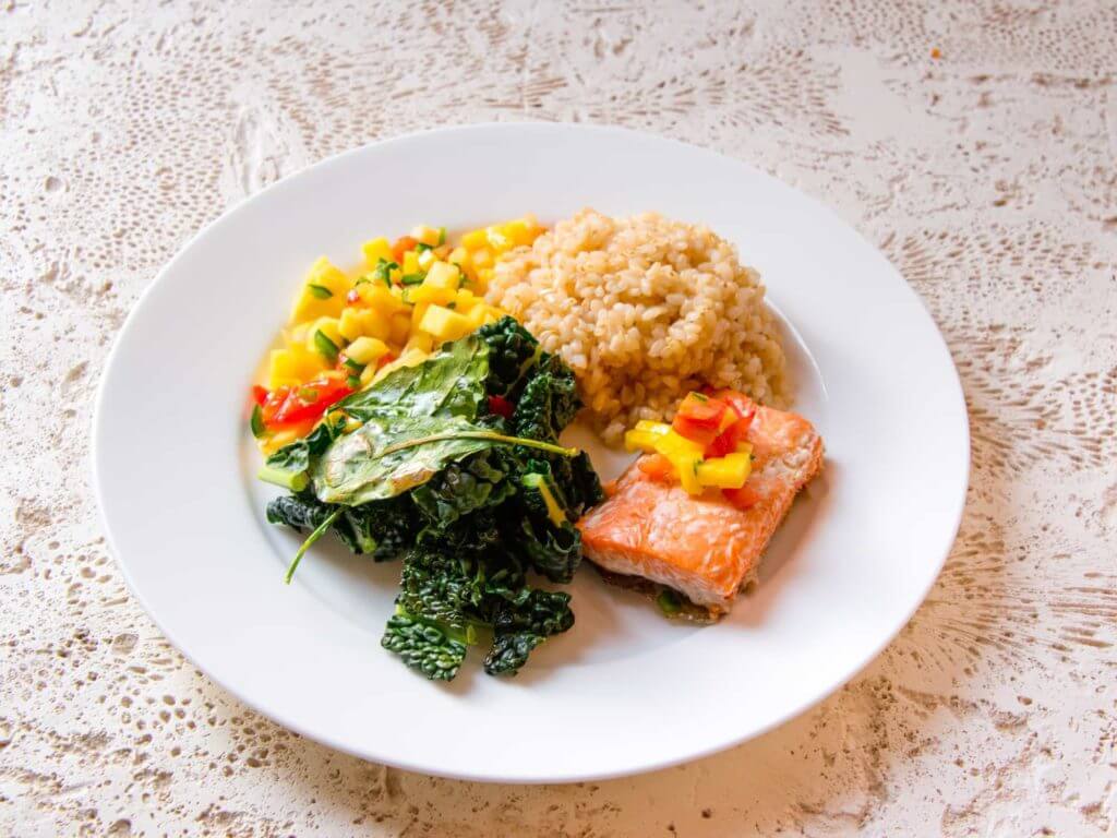 - Plate the meal as pictured, putting just a little mango salsa over the fish.