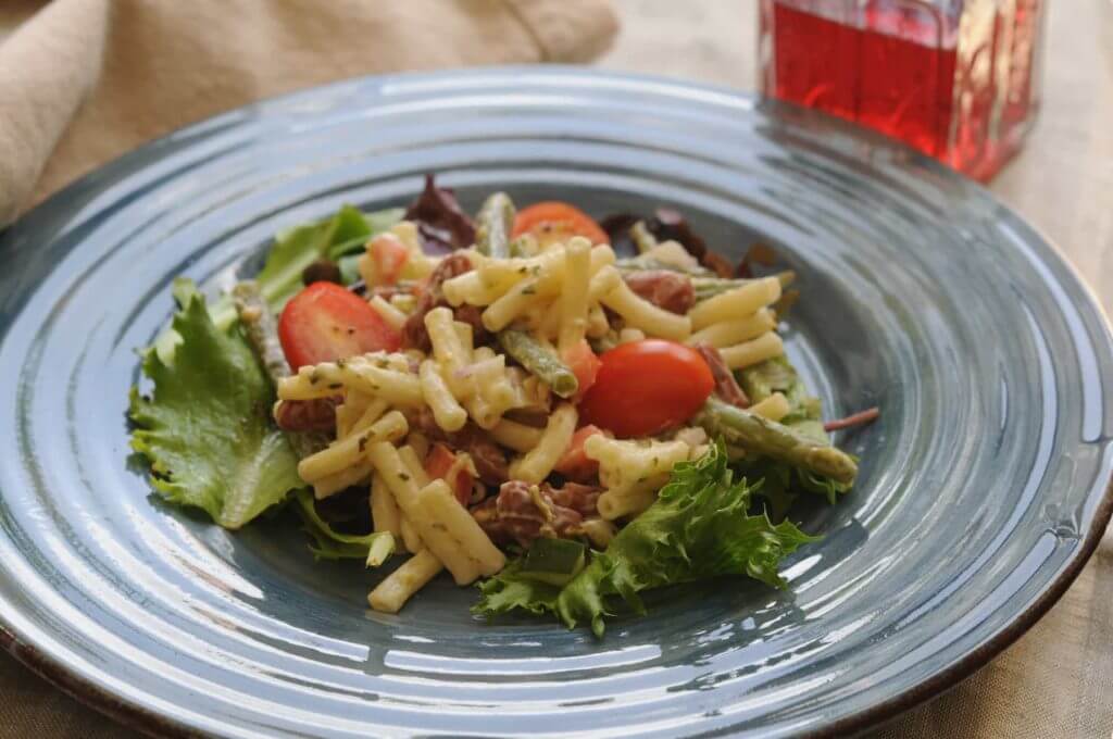 - Meanwhile, mix the rest of the ingredients together in a large mixing bowl. Add the cooked macaroni and green beans to the bowl and mix well. Cover and refrigerate until ready to serve.