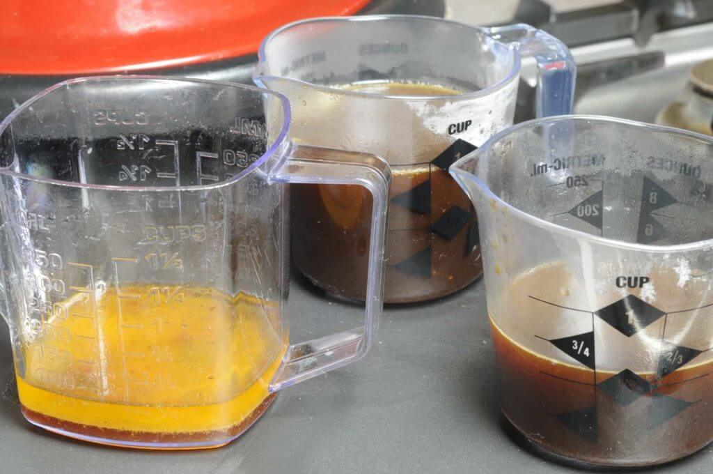 - Remove all of the fat from the turkey drippings by using a fat-remover cup. You can also do so by placing the broth in the freezer in a shallow pan. Measure the defatted turkey juice into a saucepan. Add a little water to make up the difference if needed. Add the seasonings. Bring the turkey juice to a boil over high heat and simmer a few minutes.
