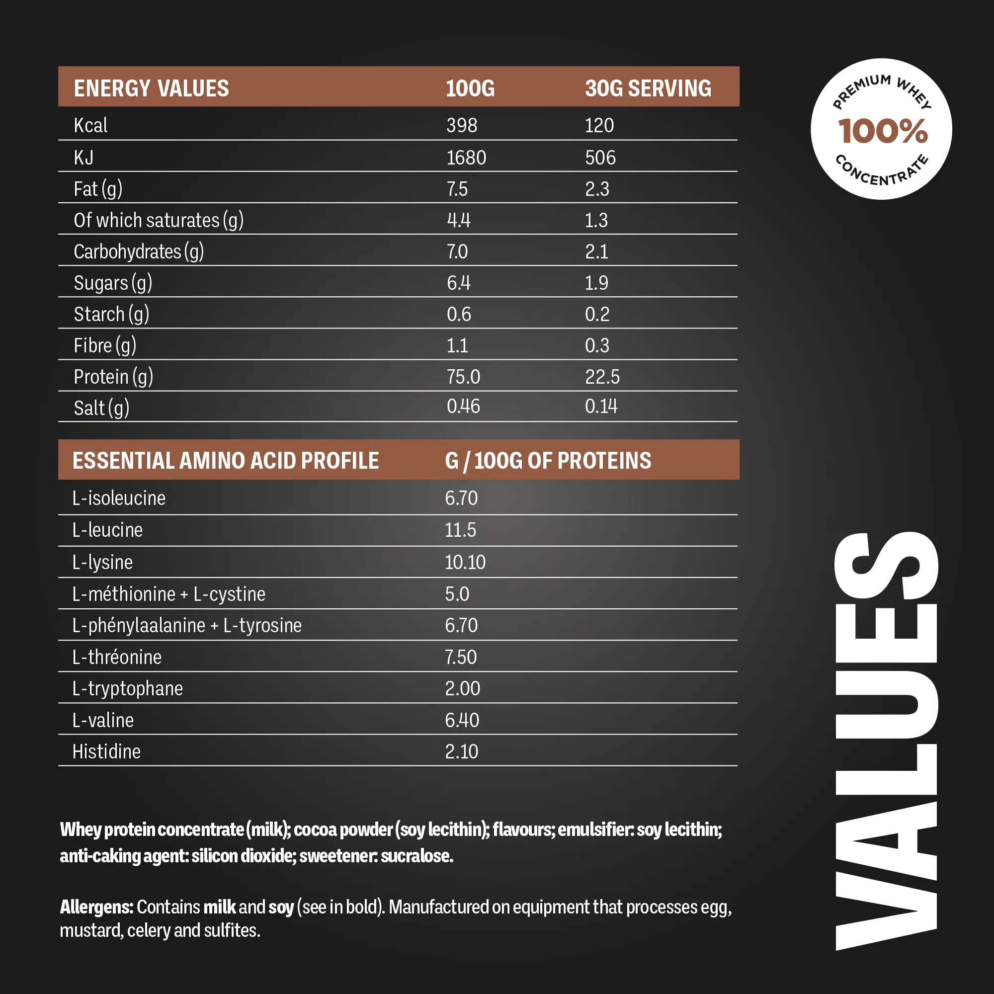 Whey protein concentrate (milk); cocoa powder (soy lecithin); flavours; emulsifier: soy lecithin; anti-cacking agent: silicon dioxide; sweetener: sucralose.