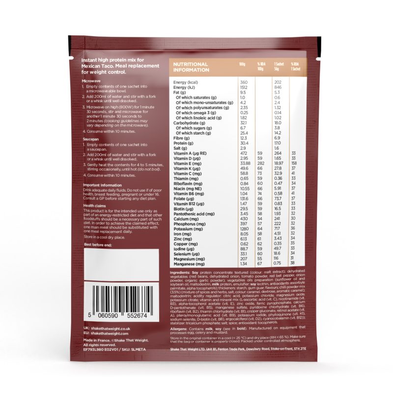 Let the warming spices of our delicious Mexican Taco meal replacement tickle your tastebuds as you work towards shedding those pounds and hitting those weight loss goals. Containing beans, red pepper, tomato, onion, garlic and chilli, you can still get the taste of your favourite Mexican meals without the calories.