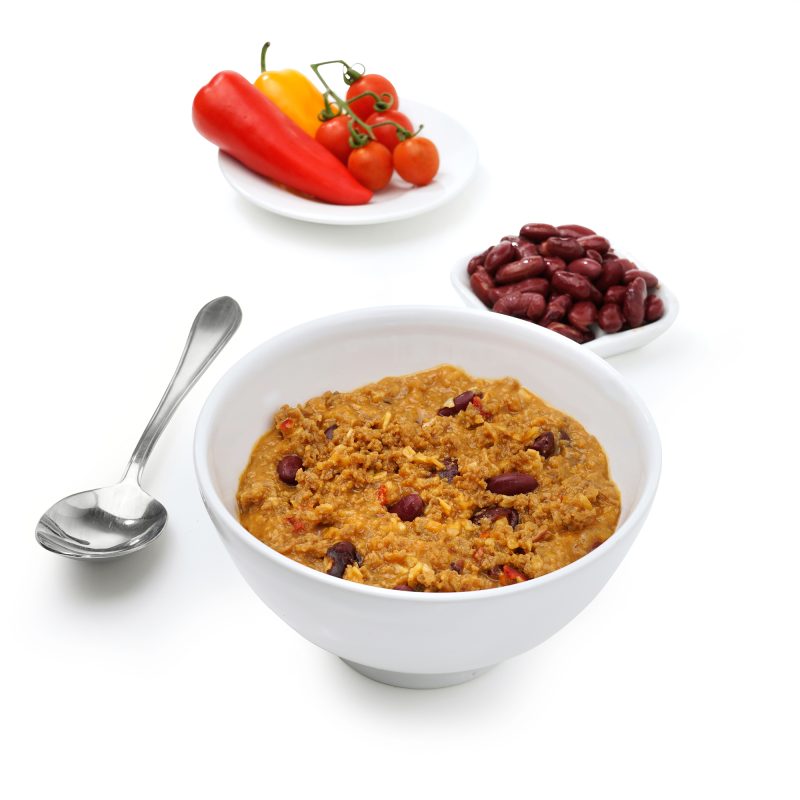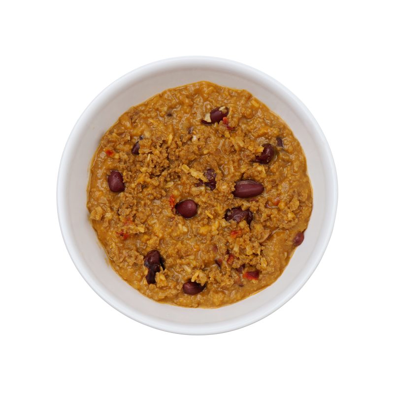 Soy protein concentrate textured (colour: malt extract); dehydrated vegetables (red beans, dehydrated onion, tomato powder, red bell pepper, onion powder, organic garlic powder); vegetables oils preparation (sunflower oil and soybean oil, maltodextrin, milk protein, emulsifier: soy lecithin, antioxidants: ascorbyle palmitate, alpha tocopherols); thickeners: starch, gum guar; flavours; chilli powder mix (3.5%) (mixture of spices and herbs, salt, colour: caramel, dextrose, aromatic caramel); maltodextrin; acidity regulator: citric acid, potassium chloride, magnesium oxide, potassium citrate; vitamin and mineral mix (L-ascorbic acid (vit. C), nicotinamide (vit. B3), alpha-tocopherol acetate (vit. E), zinc oxide, ferric pyrophosphate, calcium D-pantothenate (vit. B5), manganese sulfate, pyridoxine chlorhydrate (vit. B6), riboflavin (vit. B2), thiamin chlorhydrate (vit. B1), copper gluconate, retinol acetate (vit. A), pteroylmonoglutamic acid (vit. B9), potassium iodide, phylloquinone (vit. K1), sodium selenite, D-biotin (vit. B8), ergocalciferol (vit. D2), cyanocobalamin (vit. B12)); stabilizer: tricalcium phosphate; salt; spice; antioxidant: tocopherols.