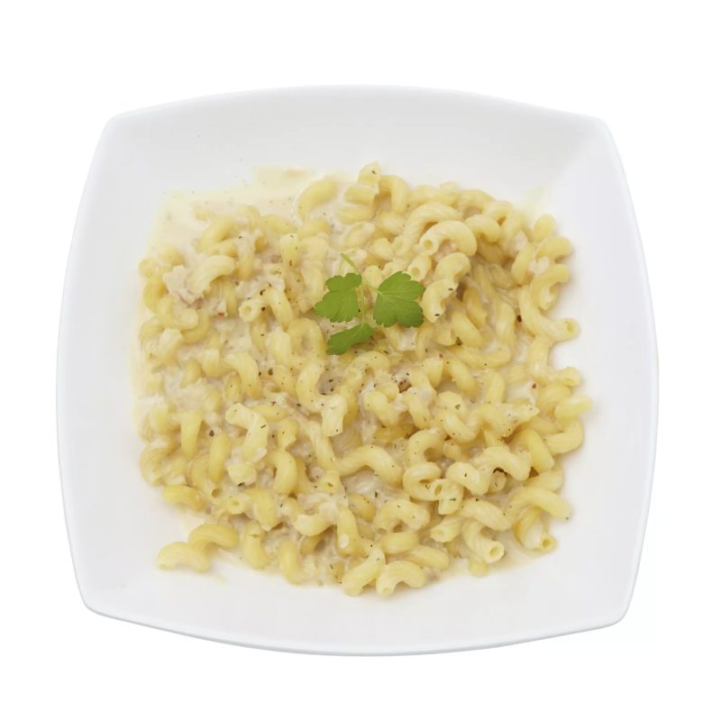 Pre-cooked pasta (44%) (durum wheat semolina (gluten)); vegetable protein blend (soy); vegetables oils preparation (sunflower oil and soybean oil, maltodextrin, milk protein, emulsifier: soy lecithin, antioxidants: ascorbyle palmitate, alpha tocopherols); buttermilk powder (milk); flavours (milk, mustard); inulin; stabilizer: tricalcium phosphate, magnesium phosphate; acidity regulators: potassium chloride, potassium citrate, magnesium oxide; onions (onion white powder, dehydrated onions); whole egg powder; vitamin and mineral mix (L-ascorbic acid (vit. C), nicotinamide (vit. B3), alpha-tocopherol acetate (vit. E), zinc oxide, ferric pyrophosphate, calcium D-pantothenate (vit. B5), manganese sulfate, pyridoxine chlorhydrate (vit. B6), riboflavin (vit. B2), thiamin chlorhydrate (vit. B1), copper gluconate, retinol acetate (vit. A), pteroylmonoglutamic acid (vit. B9), potassium iodide, phylloquinone (vit. K1), sodium selenite, D-biotin (vit. B8), ergocalciferol (vit. D), cyanocobalamin (vit. B12)); salt; organic garlic powder; thickeners: corn starch, xanthan gum, guar gum, sodium alginate; parsley; antioxidant: tocopherols; colour: beta-carotene.