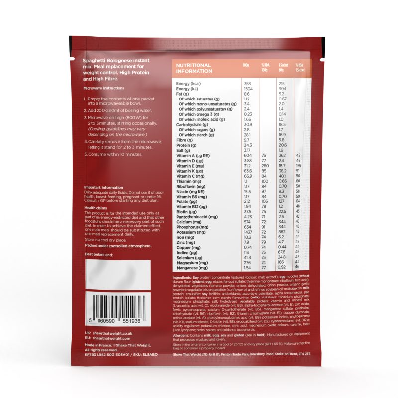 Quick and easy to make in just a few minutes, our Spaghetti Bolognese is perfect for those with a busy lifestyle, and is a great choice as a meal replacement on any of our diet plans. It’s packed full of protein and fibre that can help keep you fuller for longer and fight off those annoying cravings, as well as up to 25% of your RDA of vitamins of minerals.