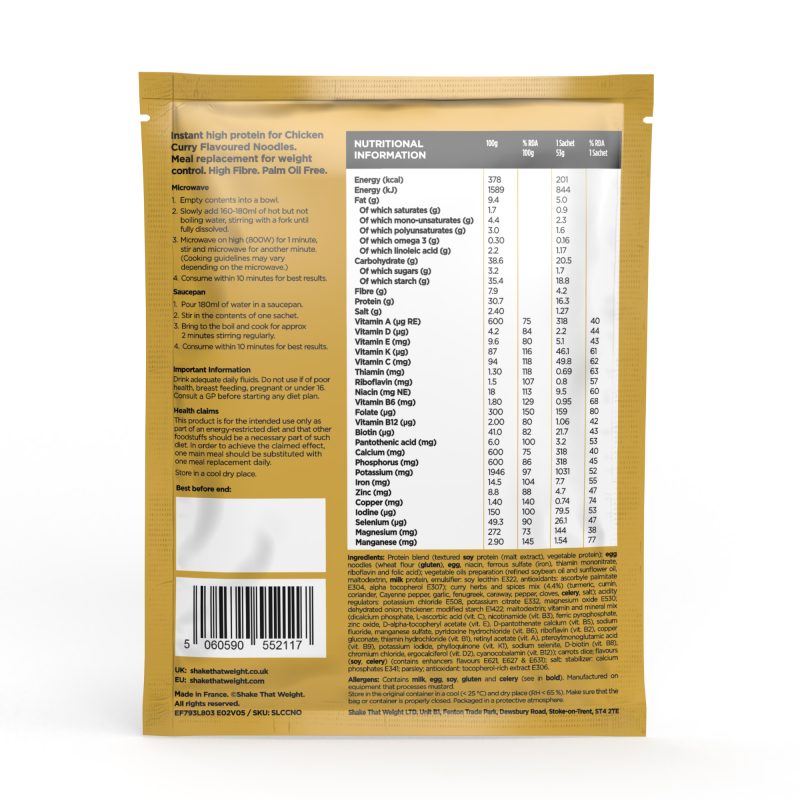 Protein blend (textured soy protein (malt extract), vegetable protein); egg noodles (wheat flour (gluten), egg, niacin, ferrous sulfate (iron), thiamin mononitrate, riboflavin and folic acid); vegetable oils preparation (refined soybean oil and sunflower oil, maltodextrin, milk protein, emulsifier: soy lecithin E322, antioxidants: ascorbyle palmitate E304, alpha tocopherol E307); curry herbs and spices mix (4.4%) (turmeric, cumin, coriander, cayenne pepper, garlic, fenugreek, caraway, pepper, cloves, celery, salt); acidity regulators: potassium chloride E508, potassium citrate E332, magnesium oxide E530; dehydrated onion; thickener modified starch E1422; maltodextrin; vitamin and mineral mix (dicalcium phosphate, L-ascorbic acid (vit. C), nicotinamide (vit. B3), ferric pyrophosphate, zinc oxide, D-alpha-tocopheryl acetate (vit. E), D-pantothenate calcium (vit. B5), sodium fluoride, manganese sulfate, pyridoxine hydrochloride (vit. B6), riboflavin (vit. B2), copper gluconate, thiamin hydrochloride (vit. B1), retinyl acetate (vit. A), pteroylmonoglutamic acid (vit. B9), potassium iodide, phylloquinone (vit. K1), sodium selenite, D-biotin (vit. B8), chromium chloride, ergocalciferol (vit. D2), cyanocobalamin (vit. B12)); carrots dice; flavours (soy, celery) (contains enhancers flavors E621, E627 & E631) salt; stabilizer calcium phosphates E341; parsley; antioxidant: tocopherol-rich extract E306.