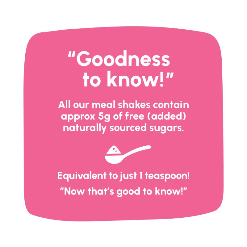 In fact each shake has approximately 5g of free (added) natural sugars which is the equivalent of a teaspoon. This means that if you used 4 of our shakes a day for a total food replacement diet you would consume 20g of free sugars daily, which is within the NHS guidelines of 30g of sugar daily for an adult.
