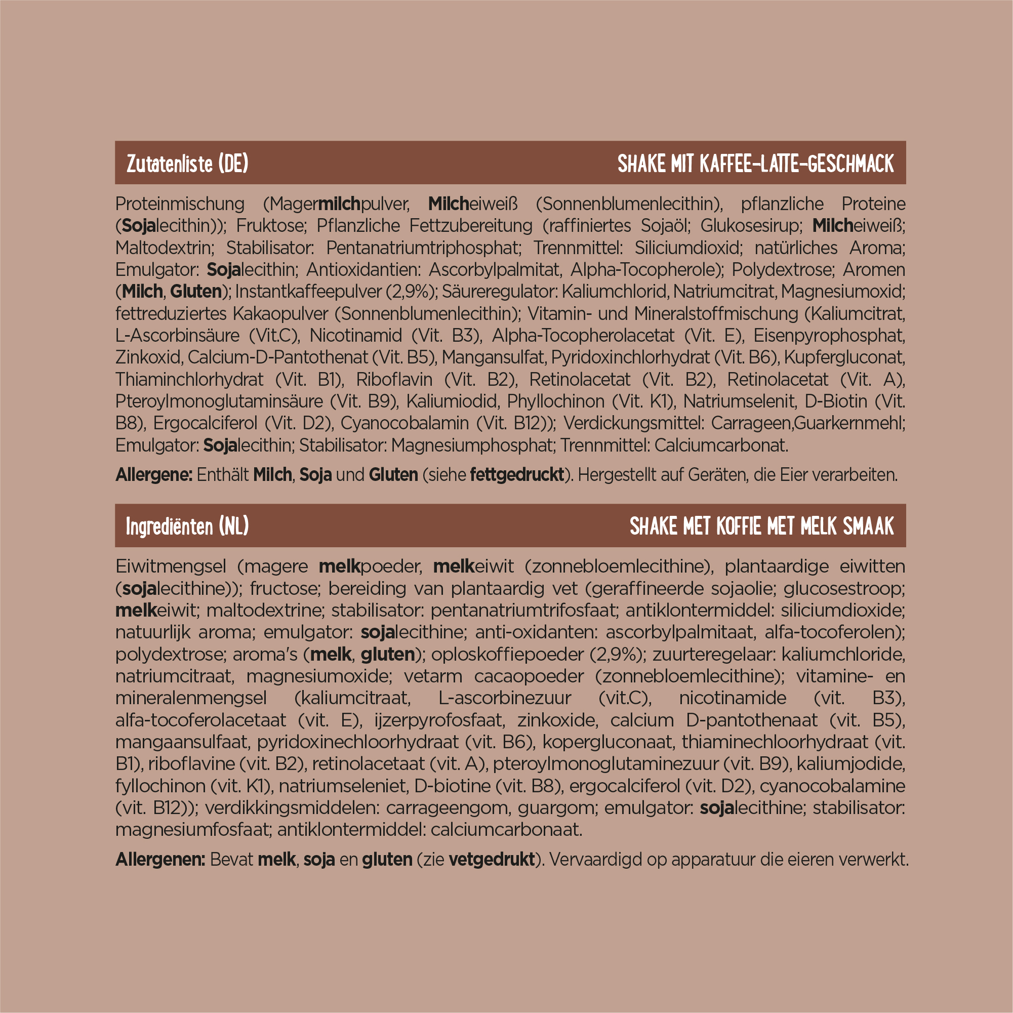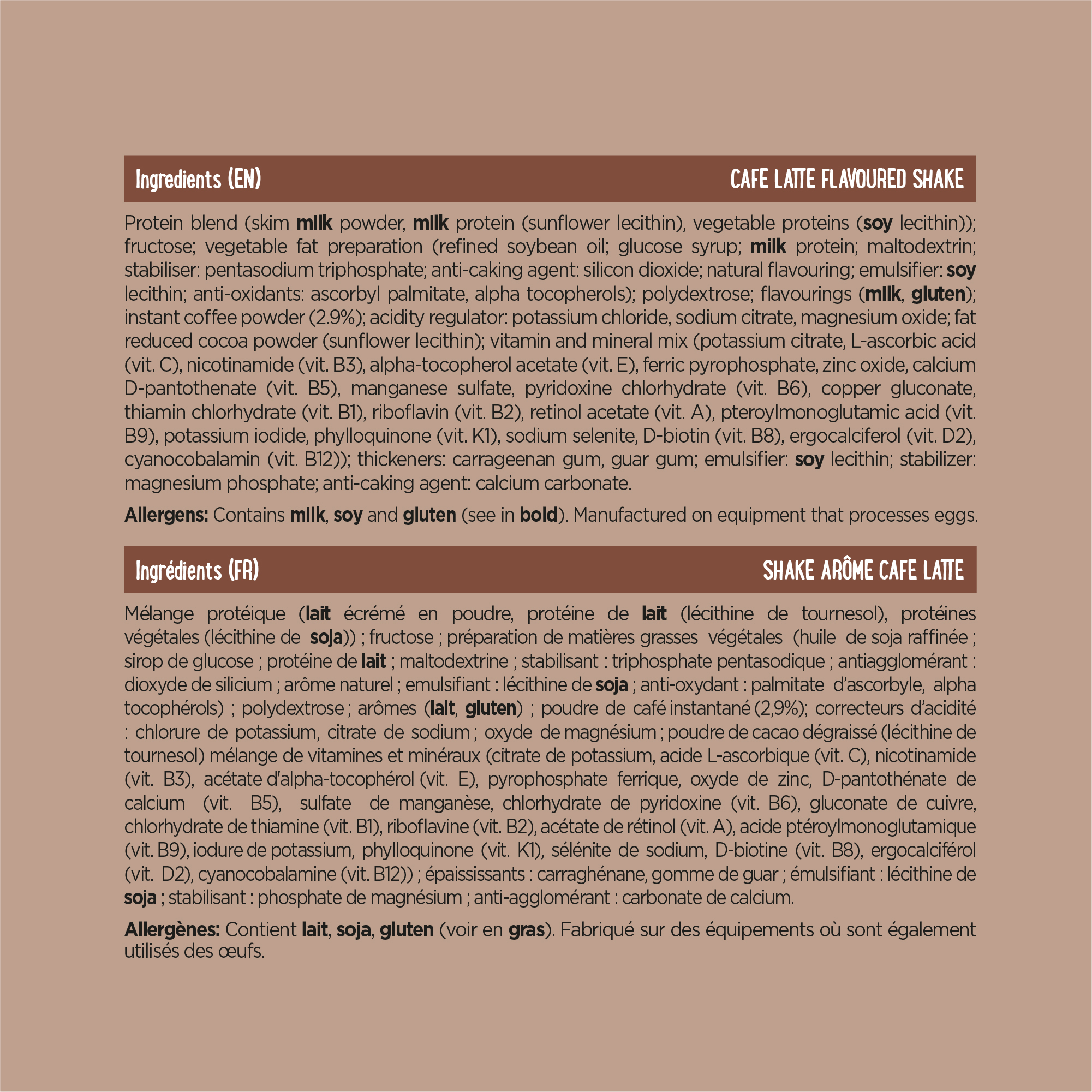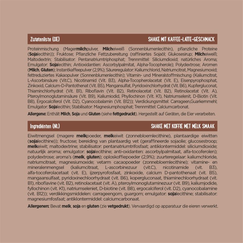 Protein blend (milk protein (emulsifier: lecithins E322), vegetable protein (emulsifier: lecithins E322 (soy)); skim milk powder; fructose; vegetable oil preparation (refined soybean oil, milk protein, maltodextrin, stabiliser : triphosphates E451, emulsifier: lecithins E322, natural flavour); vitamin and mineral mix (potassium, sodium, calcium, iron, zinc, manganese, copper, iodine, selenium, vit A, vit B1, vit B2, vit B3, vit B5, vit B6, vit B8, vit B9, vit B12, vit C, vit D, vit E, vit K) ; polydextrose E1200; flavours (milk); instant coffee powder (2.9%); fat reduced cocoa powder (emulsifier: lecithins E322); thickeners: carrageenan E407, guar gum E412; stabiliser: magnesium phosphates E343; emulsifier: lecithins E322 (soy); malt extract.