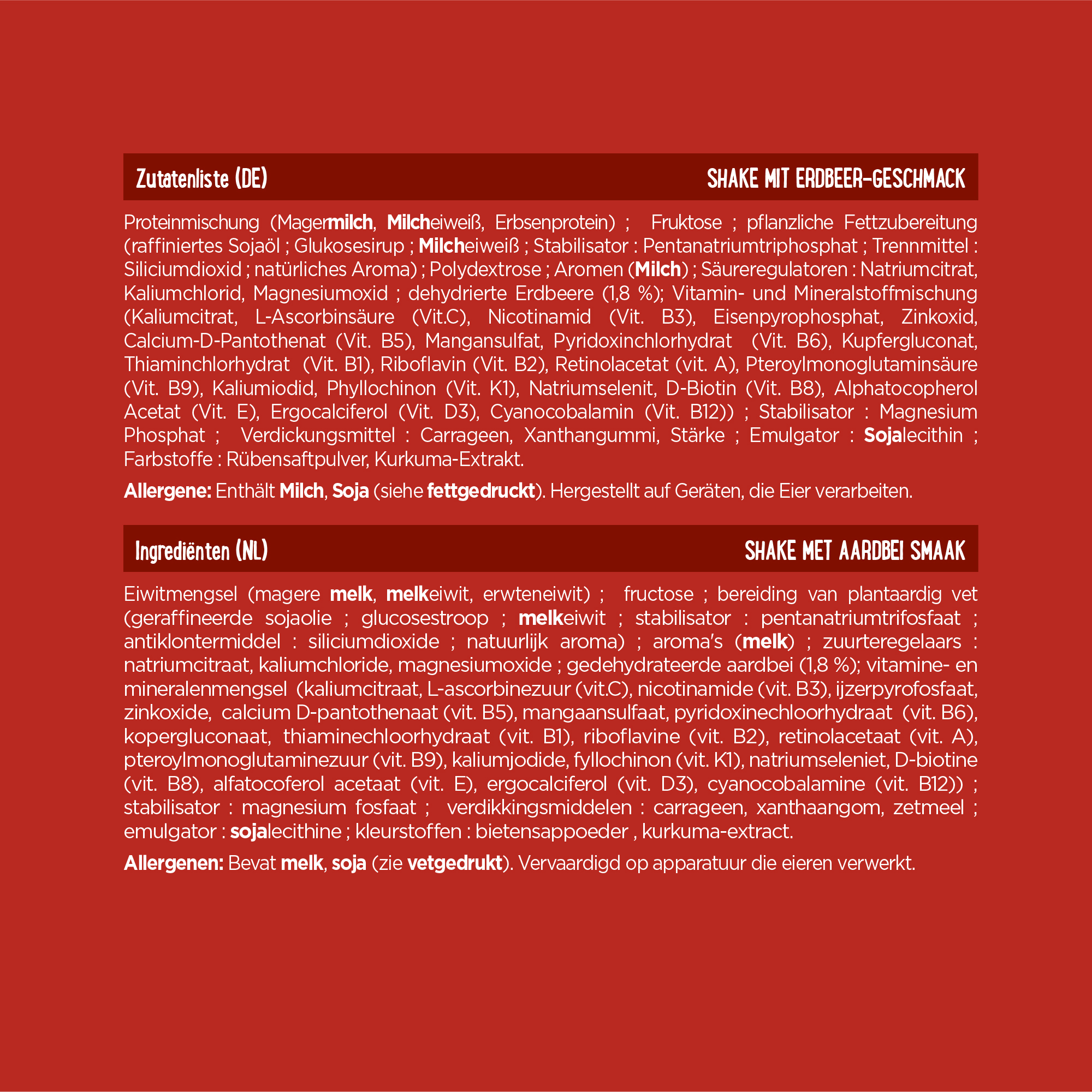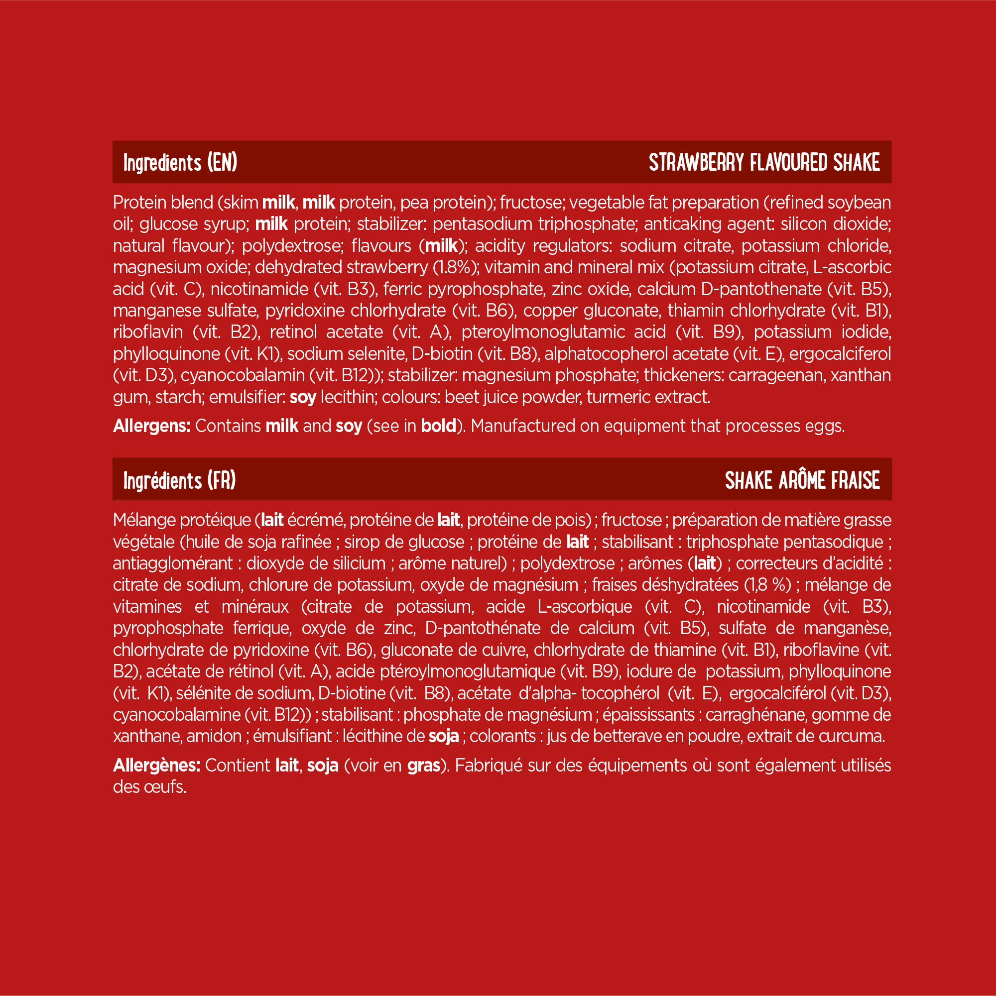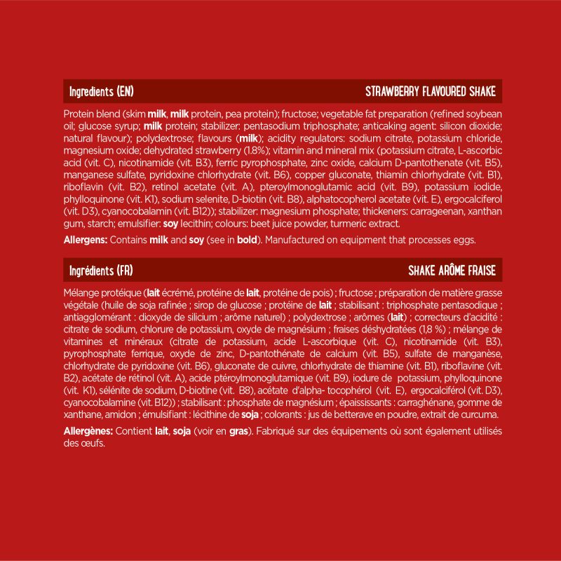 Protein blend (milk protein (emulsifier : lecithins E322 (soy)), vegetable protein) ; skim milk powder ; fructose ; vegetable oil preparation (refined soybean oil, milk protein, stabiliser : triphosphates E451, natural flavour) ; polydextrose E1200 ; flavours (milk) ; vitamin and mineral mix (sodium, potassium, magnesium, iron, zinc, manganese, copper, iodine, selenium, vit A, vit B1, vit B2, vit B3, vit B5, vit B6, vit B8, vit B9, vit B12, vit C, vit D, vit E, vit K) ; dehydrated strawberry (1.8%) ; thickeners : guar gum E412, carrageenan E407, starch ; stabiliser : magnesium phosphates E343 ; colours : beetroot red E162, curcumin E100.