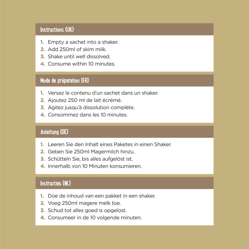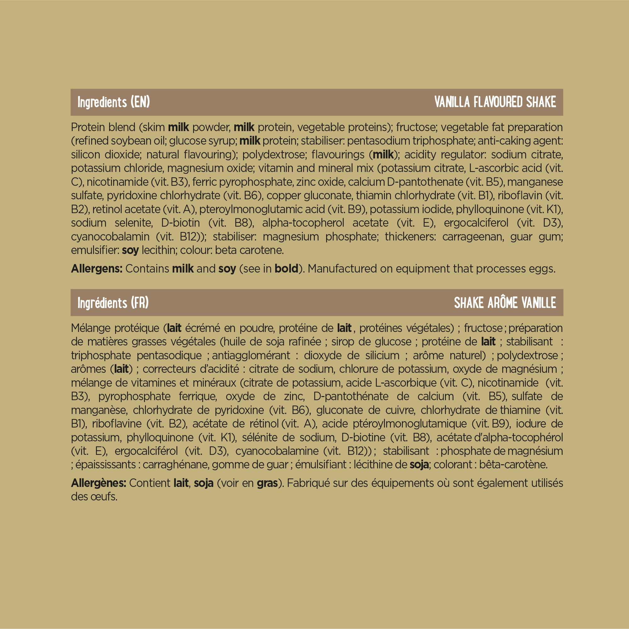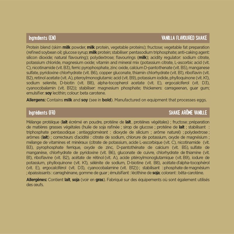 Protein blend (milk protein (emulsifier : lecithins E322 (soy)), vegetables protein) ; skim milk powder ; fructose ; vegetable oil preparation (refined soybean oil, milk protein, stabiliser : triphosphates E451, natural flavour) ; polydextrose E1200 ; flavours (milk) (contains caramel color E150d) ; vitamin and mineral mix (sodium, potassium, magnesium, iron, zinc, manganese, copper, iodine, selenium, vit A, vit B1, vit B2, vit B3, vit B5, vit B6, vit B8, vit B9, vit B12, vit C, vit D, vit E, vit K) ; thickeners : carrageenan E407, guar gum E412 ; stabiliser : magnesium phosphates E343 ; color : beta carotene E160a.