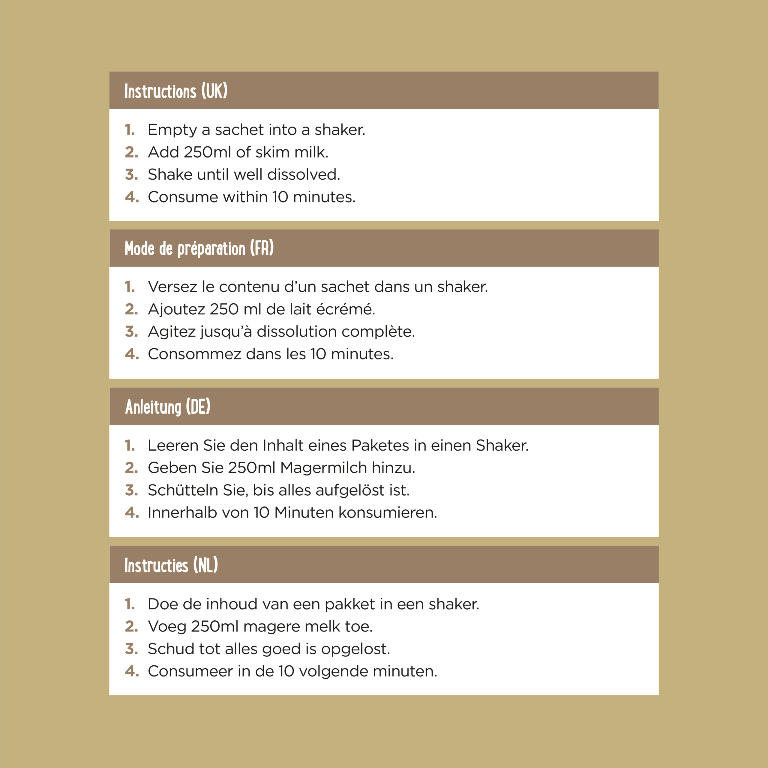 The rest of the sugars you see in our nutritional table come from the milk and whey protein used to make our shakes. Sugar found naturally in milk, fruit and vegetables does not count as free sugars. We do not need to cut down on these sugars, but remember that they are included in the “total sugar” figure found on food labels and in our nutritional tables. The sugars in milk are essential for health. Lactose is a critical nutrient that provides energy, helps with digestion, and confers a range of health benefits.