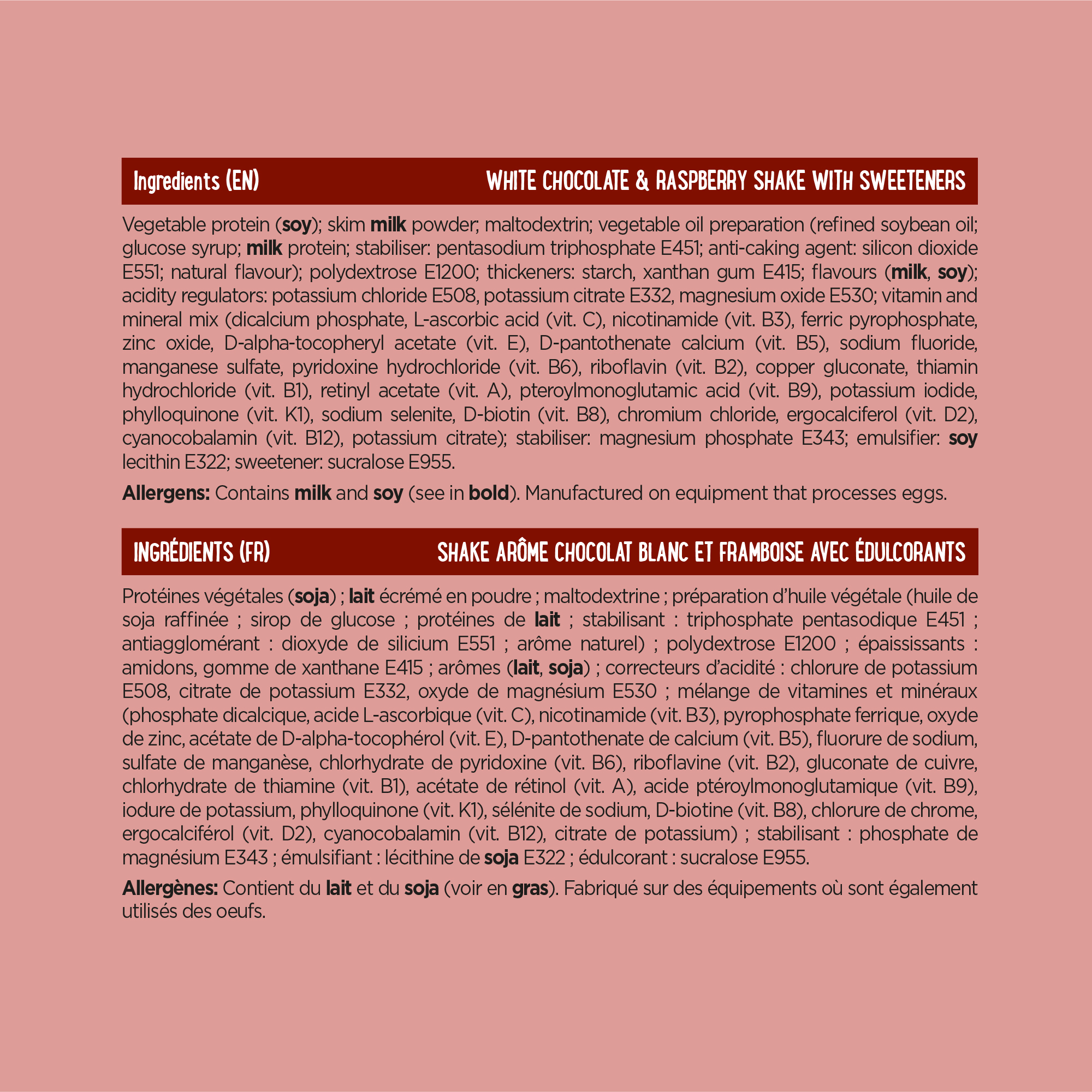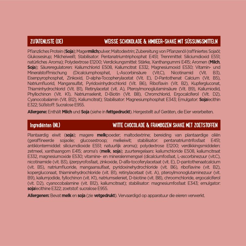 Vegetable protein (soy); skim milk powder; maltodextrin; vegetable oil preparation (refined soybean oil; glucose syrup; milk protein; stabiliser: pentasodium triphosphate E451; anti-caking agent: silicon dioxide E551; natural flavour); polydextrose E1200; thickeners: starch, xanthan gum E415; flavours (milk, soy); acidity regulators: potassium chloride E508, potassium citrate E332, magnesium oxide E530; vitamin and mineral mix (dicalcium phosphate, L-ascorbic acid (vit. C), nicotinamide (vit. B3), ferric pyrophosphate, zinc oxide, D-alpha-tocopheryl acetate (vit. E), D-pantothenate calcium (vit. B5), sodium fluoride, manganese sulfate, pyridoxine hydrochloride (vit. B6), riboflavin (vit. B2), copper gluconate, thiamin hydrochloride (vit. B1), retinyl acetate (vit. A), pteroylmonoglutamic acid (vit. B9), potassium iodide, phylloquinone (vit. K1), sodium selenite, D-biotin (vit. B8), chromium chloride, ergocalciferol (vit. D2), cyanocobalamin (vit. B12), potassium citrate); stabiliser: magnesium phosphate E343; emulsifier: soy lecithin E322; sweetener: sucralose E955.