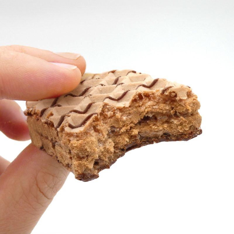 Protein blend (milk protein, hydrolysed gelatine) ; fortified wheat (gluten) flour (wheat (gluten) flour, calcium carbonate, iron, niacin, thiamin) ; palm oil ; cocoa mass ; sugar ; fructose ; emulsifier : soy lecithin ; cocoa butter ; flavourings ; defatted cocoa powder ; pea protein ; soya flour ; sunflower oil ; salt ; milk fat ; raising agent : sodium bicarbonate ; cornflour.